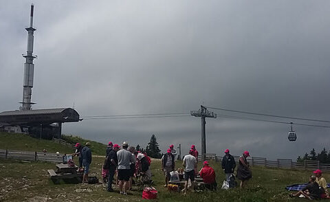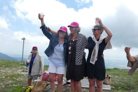 Après le sport (montée en télécabine), le réconfort, un apéro au sommet de la montagne, et un piquenique très sympa pour notre petite équipe facilement reconnaissable à ses casquettes roses !!!!